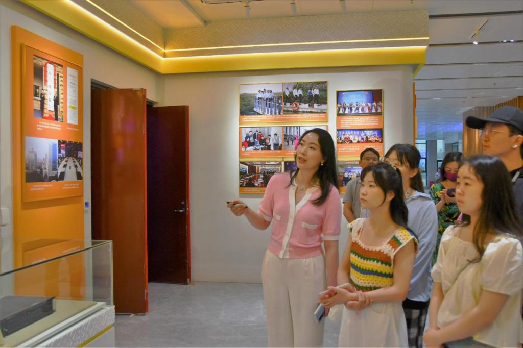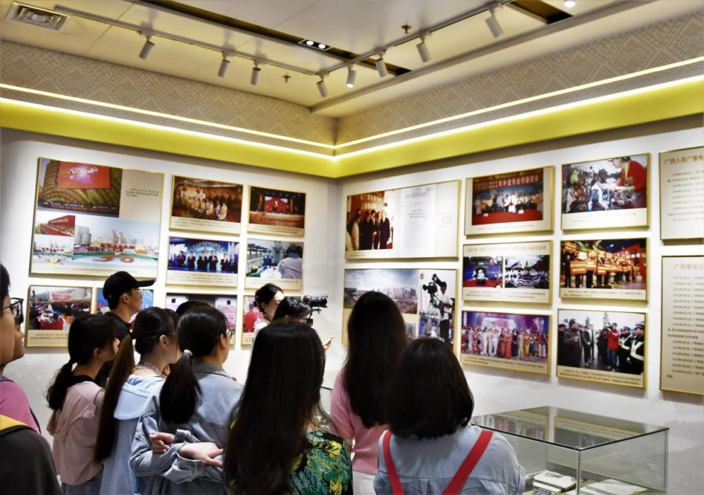 在广西台新大楼的一楼大厅里,一张张图片,一件件实物,一段段文字,记载了一代代电视媒体人的峥嵘岁月,主持人叶倩老师向来访师生回顾了广西广播电视台自1950年建台以来的奋斗历程,大家不时停留驻足、仔细端详,交流感悟。