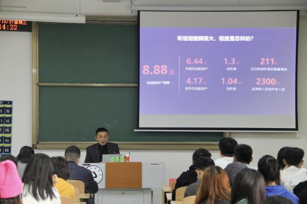 在会上,来自腾讯的安华飞老师团绕短视频创作进行讲解,从短视频平台、发展现状、亮点、未来发展趋势多角度分析;例举papi酱李子柒两位优质up主的成功案例强调了增强用户黏性,持续优质内容输出的重要性;并设置了有奖答题互动环节,同学们踊跃参与,积极发言。