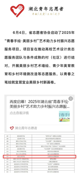 近日,湖北省志愿者协会公布了2025年“青春手绘·美丽乡村”艺术助力乡村振兴志愿服务项目入选团队名单。经专家组审定,3044永利集团“文韵传承”志愿服务队从全国5000余支团队中脱颖而出,成功入选160支全国重点团队之一,标志着公司在推动志愿服务助力我省“美丽乡村”建设,深度融合乡村振兴国家战略的实践中,取得重要突破。