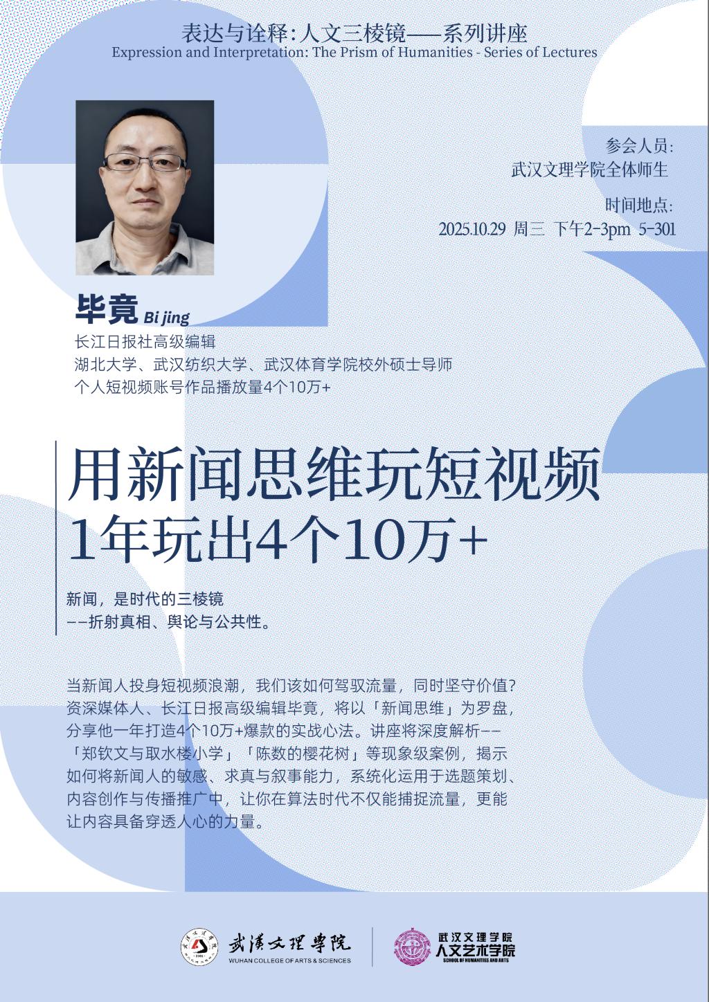 主讲人:毕竟(长江日报社高级编辑,湖北大学、武汉纺织大学、武汉体育公司校外硕士导师,个人短视频账号作品播放量 4 个 10 万 +)