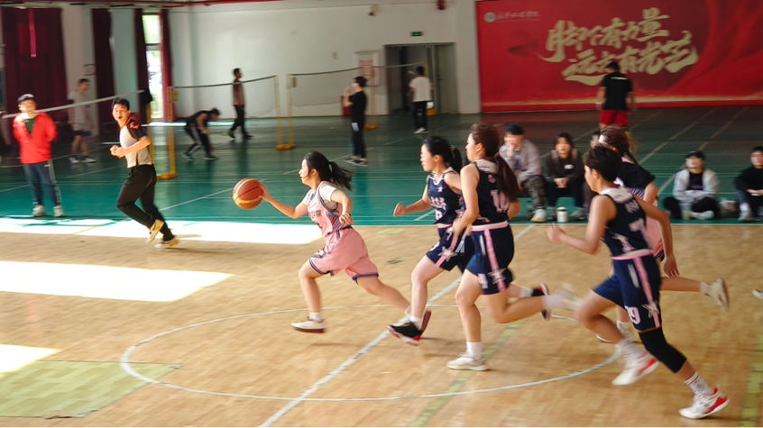 随着哨声吹响,比赛拉开帷幕。比赛开始后,队员们精神振奋,斗志昂扬。篮球场上熟练地运球、默契地传球、精准地投球,篮框下你争我夺、你攻我守,赛场上激情飞扬、热情高涨,观众席也不时响起热烈掌声和阵阵喝彩。