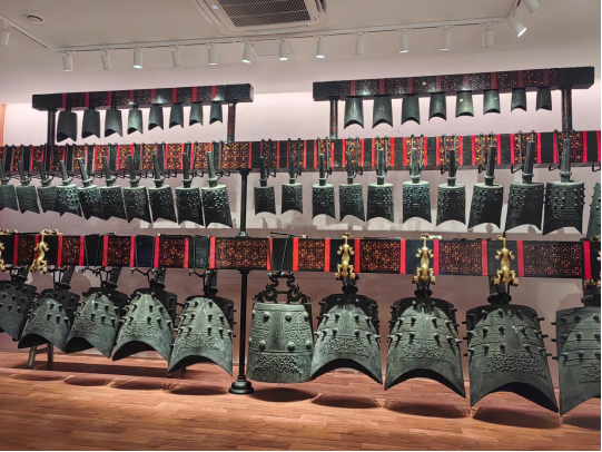 编钟馆中最令人心驰神往、翘首以盼的,当属那闻名遐迩的镇馆之宝——楚曾百钟。它由擂鼓墩 1 号墓的 64 件编钟与擂鼓墩 2 号墓的 36 件编钟共同组成。经深入研究发现,从音乐音响性能的角度来看,它们恰似两块完美契合的拼图,彼此之间正好形成一种互补的奇妙关系。当这些编钟被重新精心排列组合在一起时,一场古代音乐艺术的华丽盛宴便在人们眼前徐徐拉开帷幕,那精湛绝伦的技艺与和谐美妙的音律,无不令人叹为观止,由衷地折服于古代工匠们的智慧与匠心。