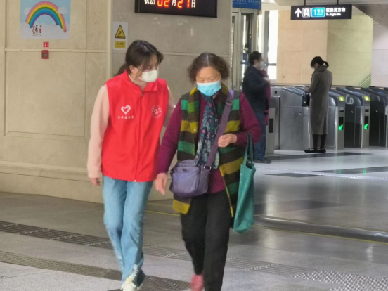 在地铁站志愿服务中,志愿者们用自己的实际行动为地铁站的乘客们提供了力所能及的帮助。在出站口有一位奶奶在出站口地图前兜兜转转了很久,住院者立即先前询问了奶奶去目的地,并带领奶奶走到相应出口。