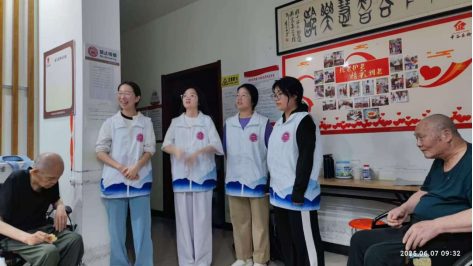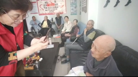 活动伊始,志愿者们以灵动的艺术表演叩响情感共鸣之门。志愿者王粤与张效萱清亮的歌声中,《走四方》的豪迈与《强军战歌》的铿锵响彻室内;志愿者程雨以专业的播音腔调深情朗诵现代诗,字里行间的炽热情感如春风拂过。老人们布满岁月痕迹的手掌,随着旋律轻轻叩击木椅扶手,佝偻的脊背不自觉挺直,仿佛枯木逢春,在艺术的滋养中重焕生机,活动室里流淌着温暖而动人的音符。