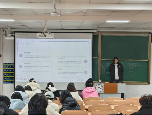 而后屏幕上出现不同地区腌肉的文字讲解,这些习俗看似琐碎,实则是古人在物质匮乏年代的时间管理智慧——利用自然条件保存食物,同时创造生活的美感。主讲人又从《黄帝内经》出发,讲述冬季养生的核心:外避寒邪,内守阳气。大雪教给同学们最重要的,或许是在寒冷中保持温暖的希望,在沉寂中相信生长的力量。