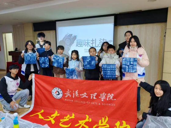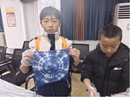 当皮筋被逐一解开,一个个“盲盒”般的惊喜接连绽放——独一无二的花纹在布面上徐徐舒展,或似星云流转,或如繁花绽放,或像水波荡漾,每一件作品都充满了意外之美。孩子们捧着属于自己的专属扎染作品,成就感在小脸上尽情洋溢,纷纷拉着同伴分享创作时的巧思与解锁花纹后的喜悦。活动最后,志愿者与孩子们手持扎染作品并肩而立,相机快门按下,将这份充满童趣与文化温度的美好瞬间永久定格。