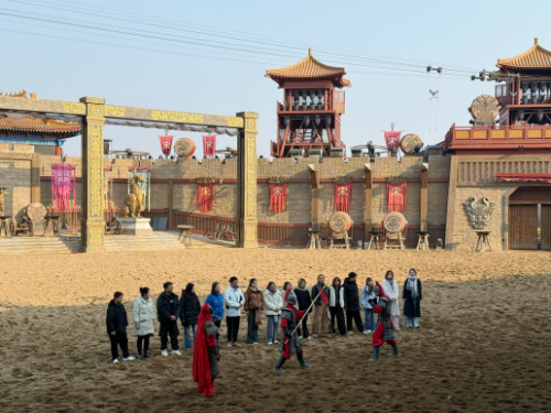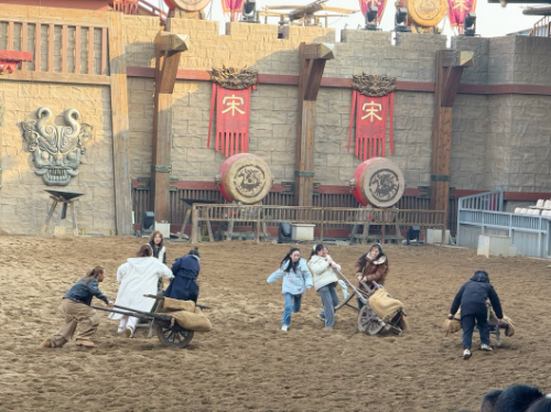 从博物馆的历史沉淀中抽离,转身便踏入“清明上河园”的热闹繁华。这里是《清明上河图》的实景复刻,一步一景皆是宋韵风情。园区里的剧目表演,更是把大宋的豪迈与浪漫演到了极致。《岳飞枪挑小梁王》绝对是必看的重头戏。在剧目正式开始前的暖场环节,公司不少员工积极参与其中,和现场工作人员互动打卡,瞬间点燃了周围观众的热情,为整场演出拉开了精彩序幕。演出开场后,骏马奔腾,战鼓擂响,岳飞一身戎装威风凛凛,与小梁王在演武场上策马交锋,枪尖相碰的铿锵声、演员们的嘶吼呐喊声,瞬间将人拉回那个金戈铁马的热血年代。
