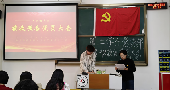 会议伊始以全体奏唱国歌拉开帷幕,党支部代表刘婉同志强调了党员发展工作的严肃性与重要性,并指出接收预备党员是党组织发展壮大的关键环节,关乎党的事业薪火相传。 随后四名发展对象依次汇报自身对党的认识、入党动机、个人经历及现实表现,深刻表达了对加入中国共产党的热切向往与思想觉悟的成长变化,以及对加入中国共产党的坚定决心。